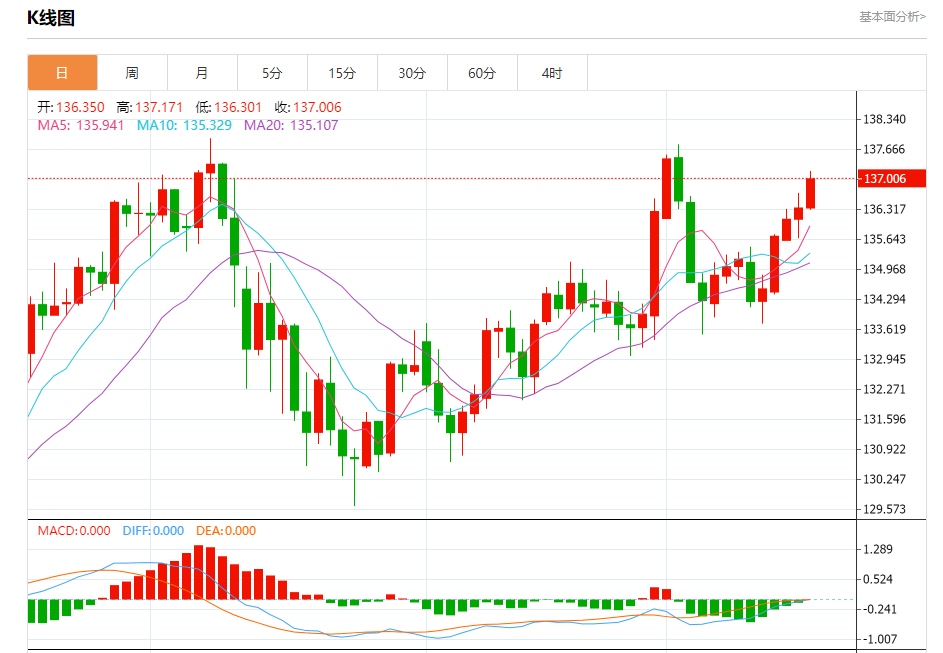 今天的预期交易区间在135.80支撑和137.50阻力之间