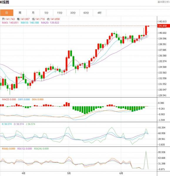行情分析:汇价高见141.967,低见141.716。上一交易日,汇价收于141.874。基本面上看,日本央行继续坚守宽松阵地,在周五的利率决议会议上维持政策利率在-0.1%不变,维持10年期日本国债收益率目标在0%左右,并且没有修改收益率曲线控制(YCC)政策。同时,日本央行称,如有必要将毫不犹豫地加码宽松,以实现可持续的2%的通常目标。日本央行货币政策与全球央行背道而驰,使得日元全面走低。技术上,小时图上行动能猛烈,仍倾向进一步走高。4小时图维持自6月低点以来的上行态势,仍有望扩大涨幅。日图突破前期高点140.90,仍看涨。