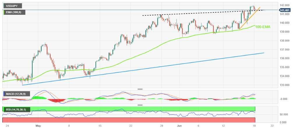 在这样做的过程中,日元对证明了RSI(14)线从超买区域撤退的合理性。然而,三周前的阻力线加入了看涨的MACD信号,在141.40附近挑战美元/日元对的盘中卖家。