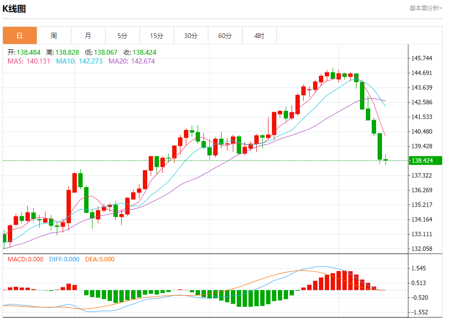 今日周四,截止目前美元兑日元报138.427,下跌0.05%。
