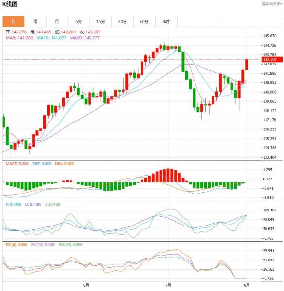 交易策略:可以在143.10---141.90的区间下限买入,有效破位40个点止损,目标在区间的上限。
