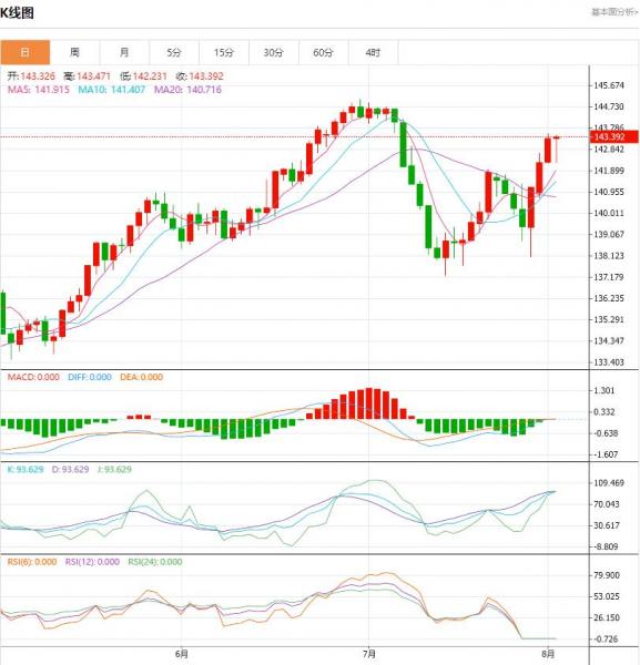 周三盘中,美元/日元货币对143.415/143.400,上升至1.040,增幅0.05%。美元兑日元有回调至低点142之虞。