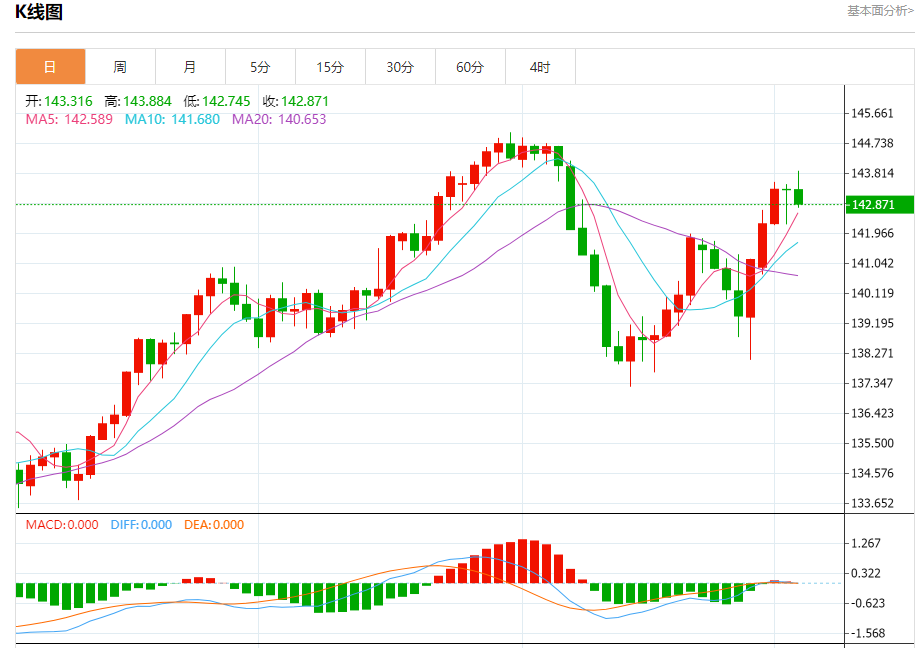 今日周四,截止目前美元兑日元报142.878,下跌0.31%。