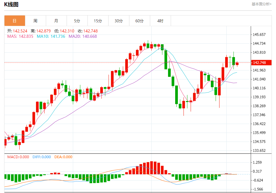 今日周五,截止目前美元兑日元报142.772,上涨0.17%。