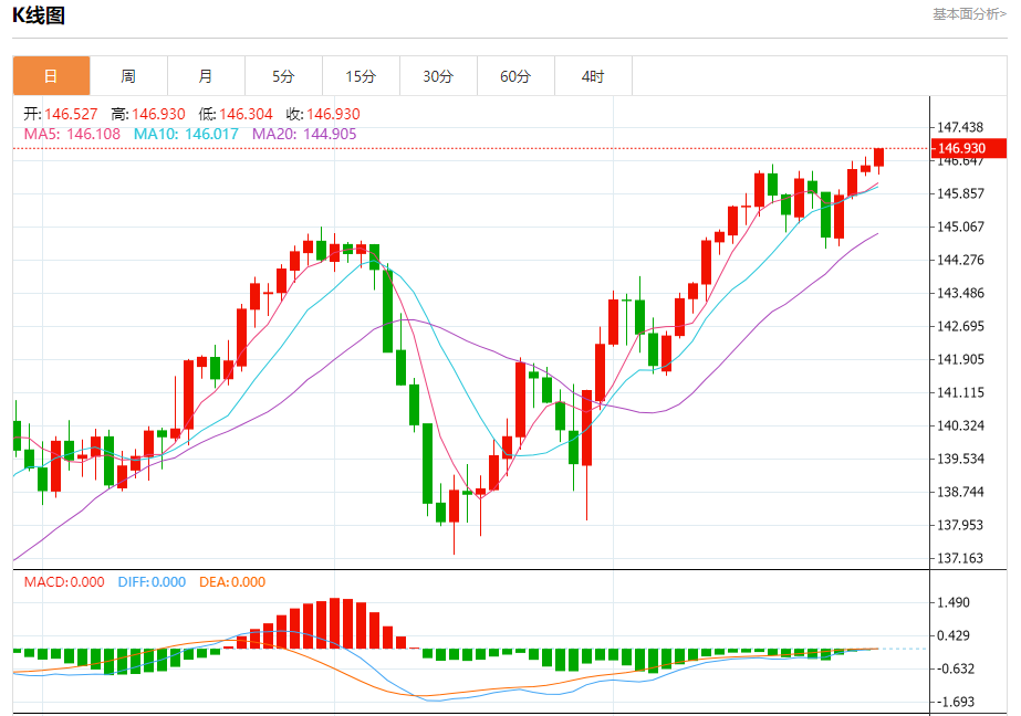 今日周二,截止目前美元兑日元报146.940,上涨0.28%。