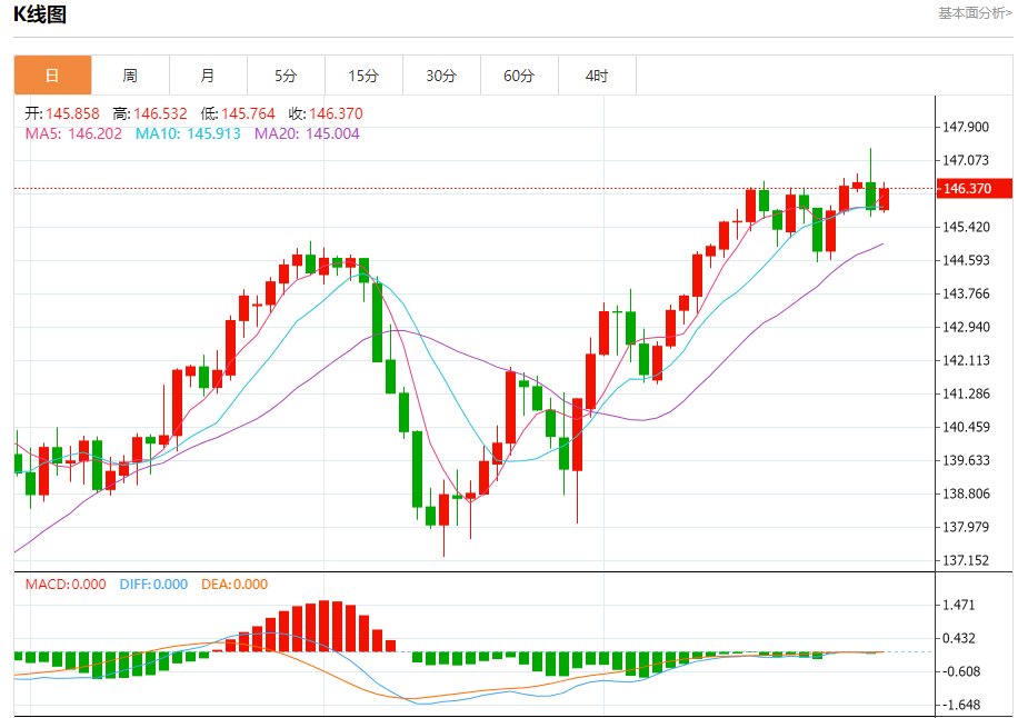 今日周三,截止目前美元兑日元报146.372,上涨0.34%。