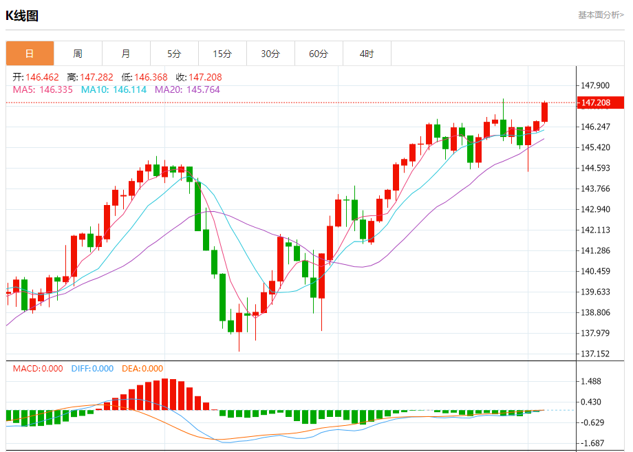 今日周二,截止目前美元兑日元报147.217,上涨0.51%。