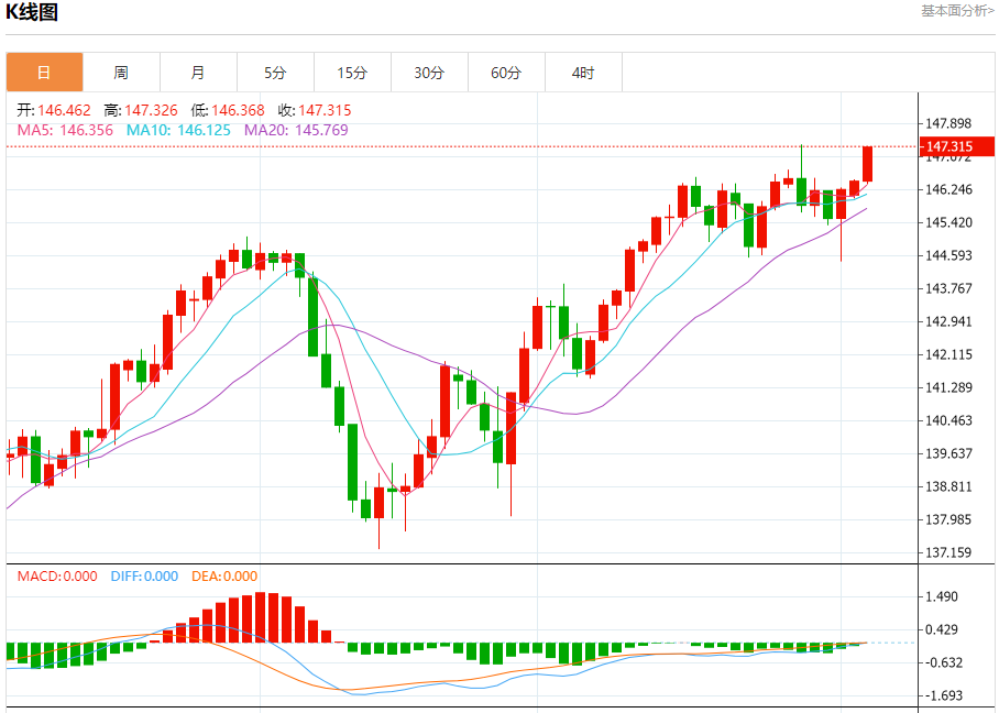 今天的预期交易区间在146.10支撑和147.60阻力之间