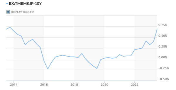 受日本央行行长植田和男的鹰派情绪提振。9月12日10年期日本国债收益率达到9年来的最高水平,突破0.7%大关。