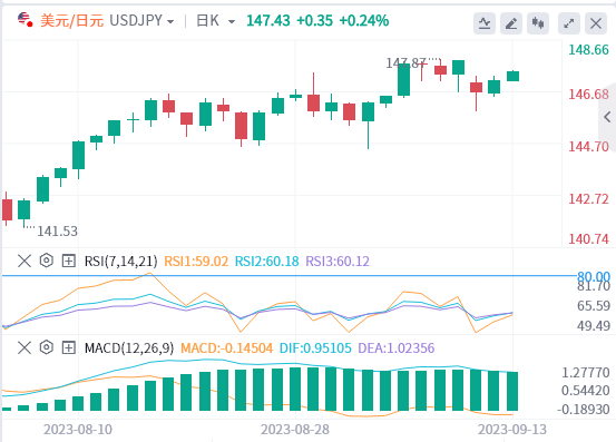 进入9月,日本市场变得愈发波动,从月初开始上涨,9月7日触及近期高位147.87。自去年美联储开始激进的加息周期以来,由于与美国国债之间的利差不断扩大,日元兑美元面临巨大压力,近期,日本政府官员也就此发出干预警告。今年以来,日元已经下跌了近11%,接近30多年来的低点,接近日本政府去年出手干预汇率的水平。尽管汇率持续承压,日本央行始终保持鸽派,坚守宽松的YCC货币政策,只在去年年底和今年7月对政策细节做出调整。市场押注越来越明显,交易员深怕日本政府威胁进行干预以提振日元,这将持续成为美元/日元主要障碍。日本央行行长直田和男最新讨论了工资增长和消费者需求,以推动需求驱动型通胀的必要性。截至发稿,美元/日元报价147.43。
