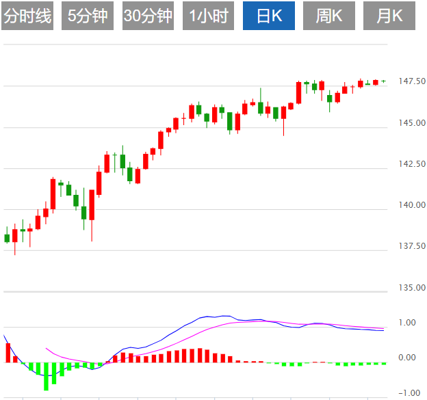 今日预期交易区间在147.20支撑位和148.70阻力位之间
