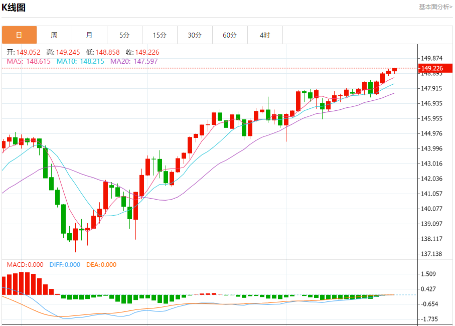 今日周三,截止目前美元兑日元报149.243,上涨0.12%。