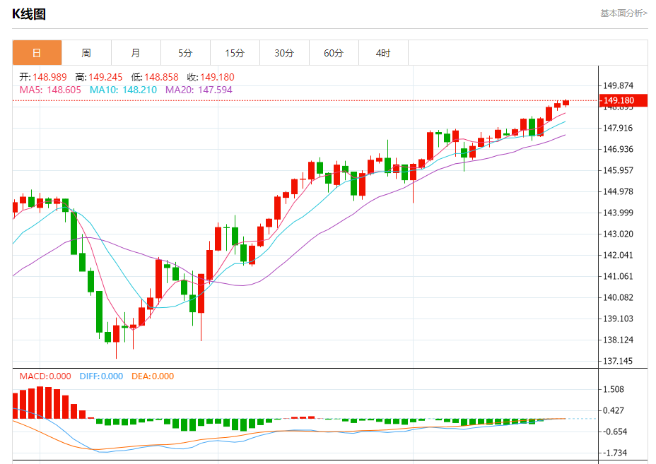 今天的预期交易区间在148.30支撑和149.80阻力之间