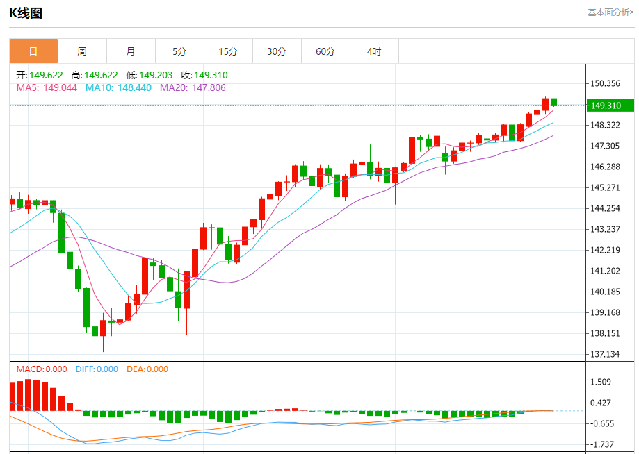 今日周四,截止目前美元兑日元报149.322,下跌0.21%。