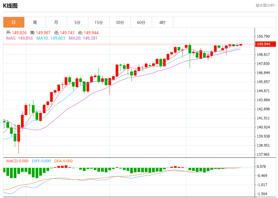 今日周一,截止目前美元兑日元报149.955,上涨0.06%。
