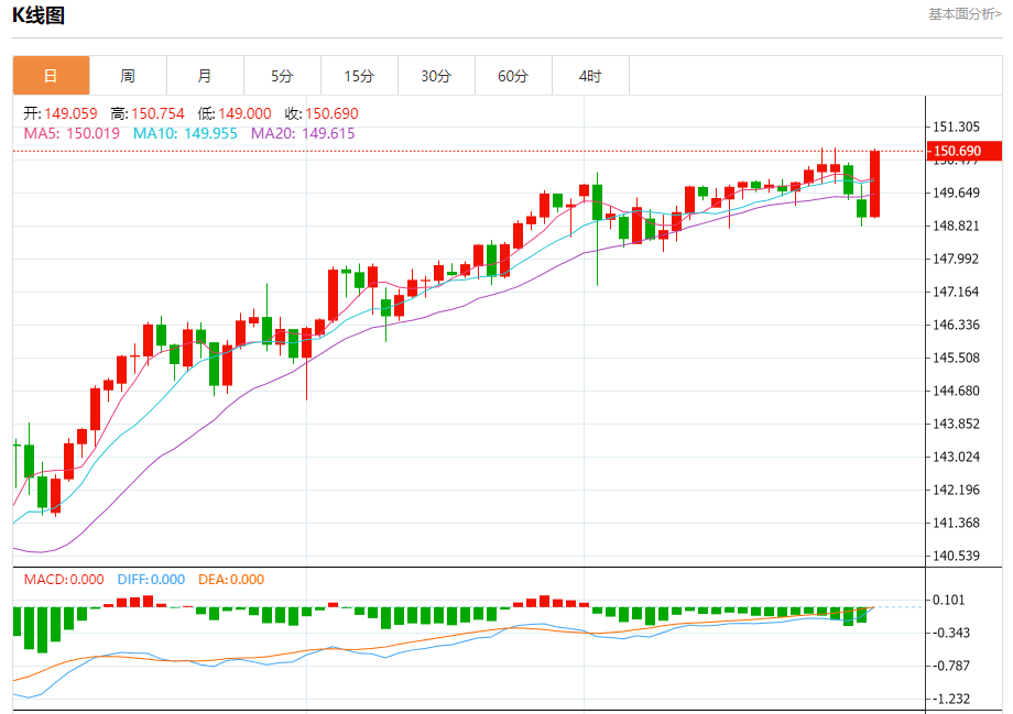 今日周二,截止目前美元兑日元报150.705,上涨1.10%。