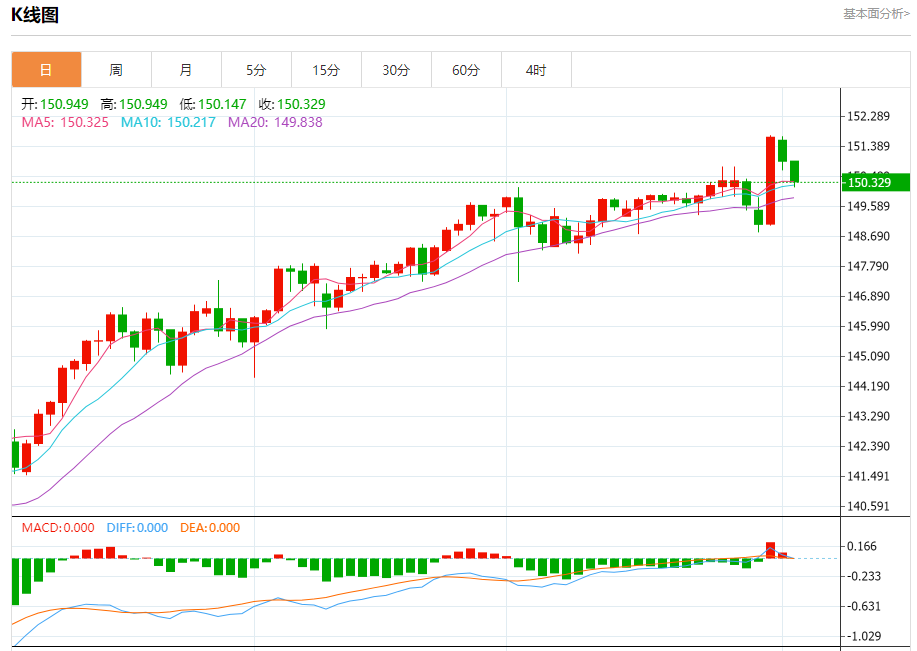 今日周四,截止目前美元兑日元报150.331,下跌0.42%。