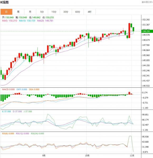 行情分析:汇价高见150.949,低见149.842。上一交易日,基本面上看,日本央行周二将10年期公债收益率的1%上限重新定义为参考利率,而不是硬性上限,在那之后美元对日元触及一年高点。这一调整令许多投资者大失所望,他们原本期待日本央行会更坚决地放弃超宽松的货币政策。此举不足以缩小日本与其他国家之间债券收益率的巨大差距,而这正是日元兑美元汇率今年下跌近14%的原因。技术面上看,10月美联储的利率会议未对日元造成进一步的严重冲击,日元暂时略有舒缓。但是日本央行在结束宽松货币政策道路上的踯躅慢行,预料仍会刺激投资者继续试图探寻财务省的红线在哪里。