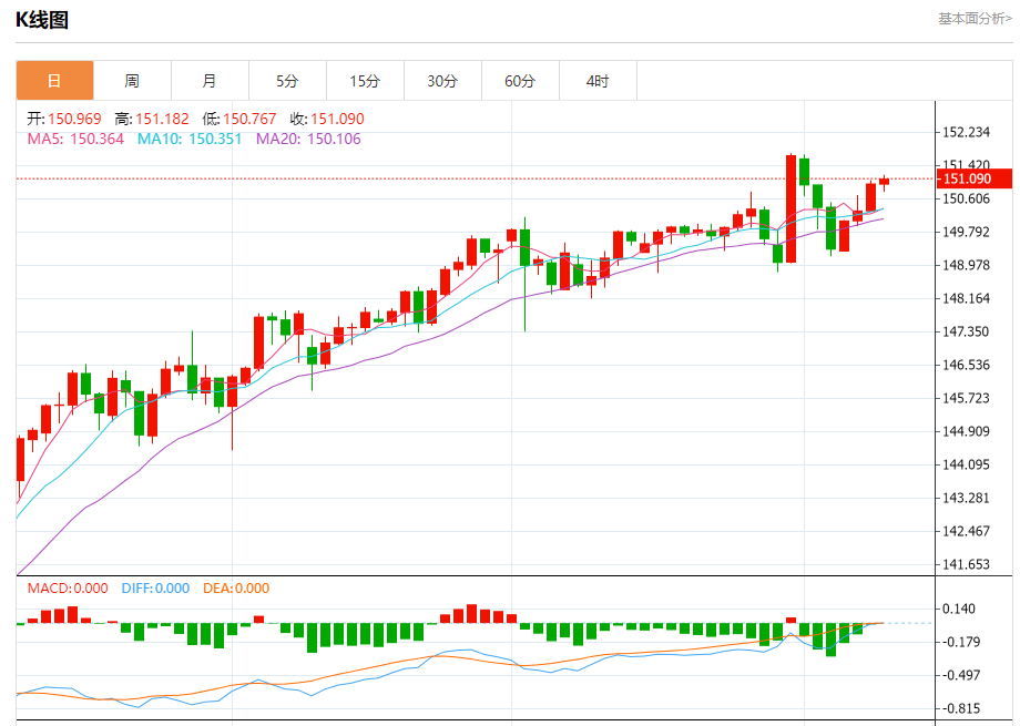 周四纽盘,美元兑日元交投于151.100,涨幅为0.08%。