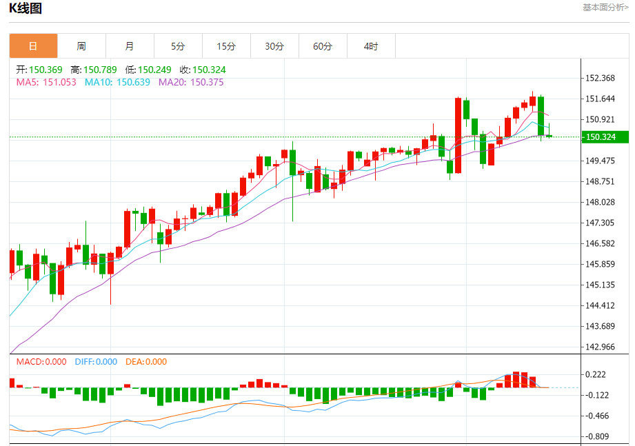 今日周三,截止目前美元兑日元报150.332,下跌0.03%。