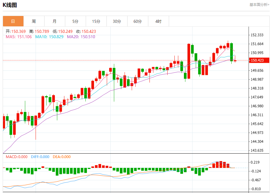 周三纽盘,美元兑日元交投于150.423,涨幅为0.03%。