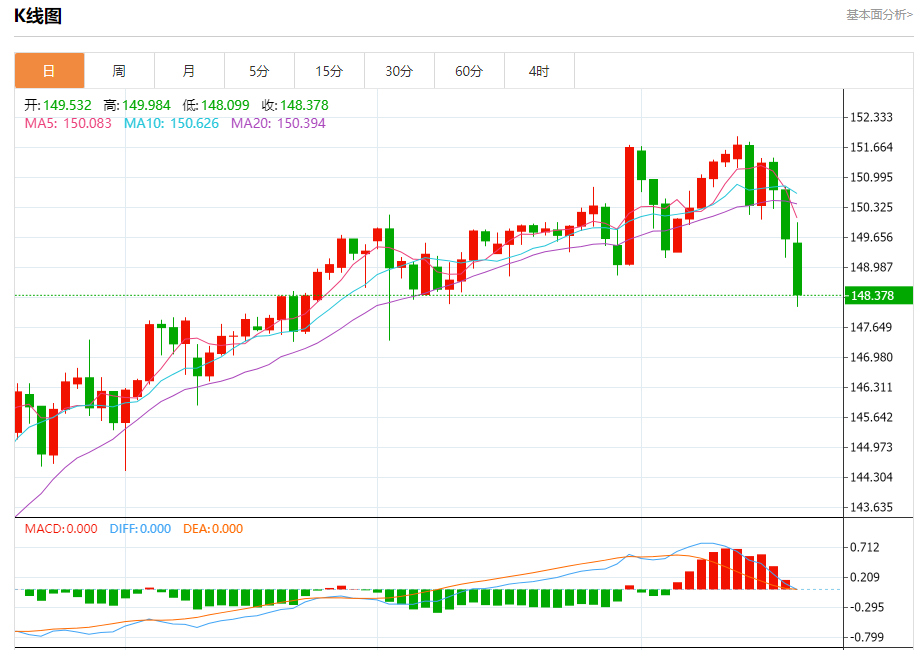今天的预期交易区间在148.10支撑和149.80阻力之间