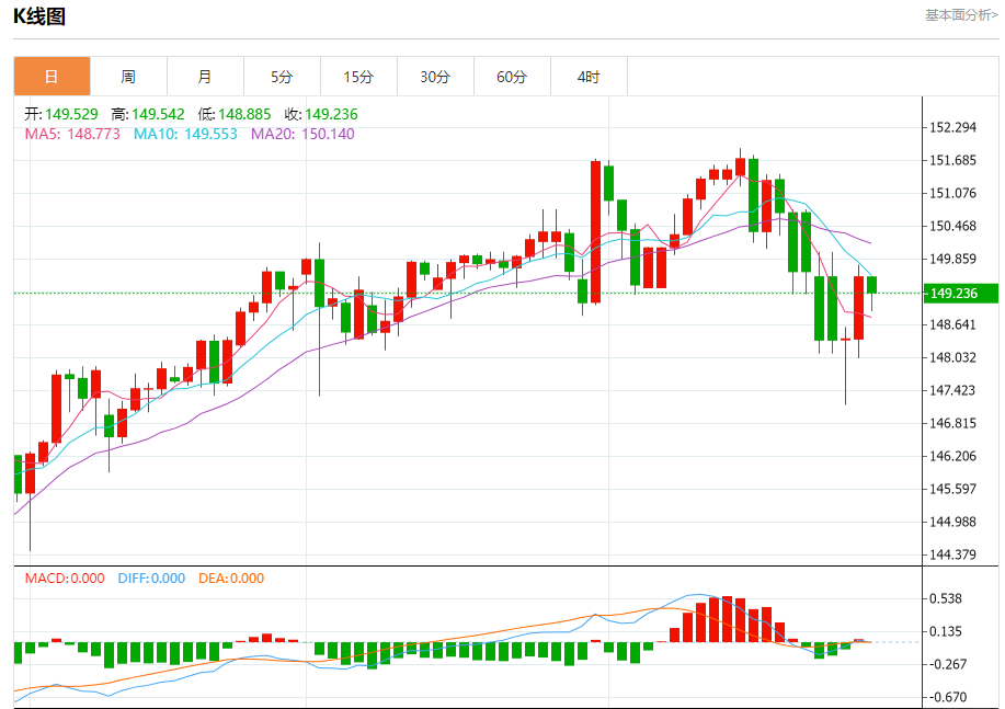 今日周四,截止目前美元兑日元报149.273,下跌0.18%。