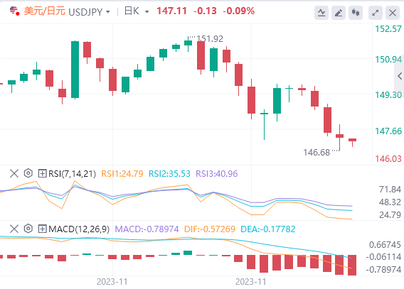 11月中旬,日元一度下跌到1美元兑换151.92日元,距离33年来的新低只有一步之遥。截至目前,美元/日元报价147.10,本月下跌3.03%。