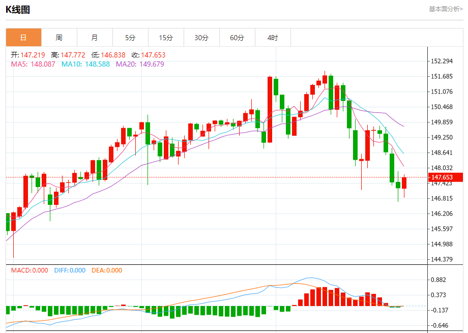 今天的预期交易区间在146.20支撑和147.60阻力之间