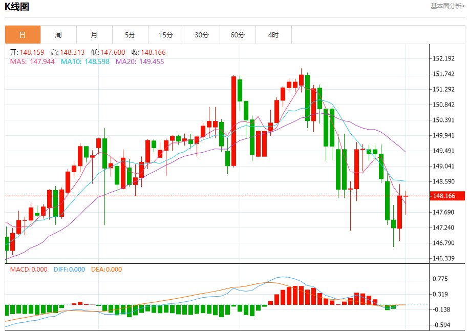 今天的预期交易区间在147.10支撑和148.60阻力之间