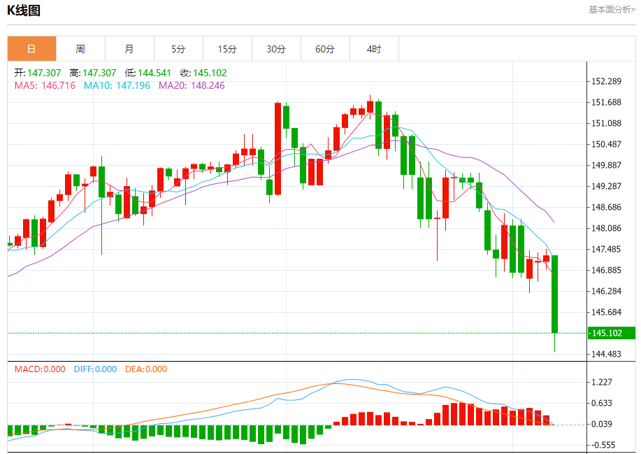 今日周四,截止目前美元兑日元报145.113,下跌1.50%。