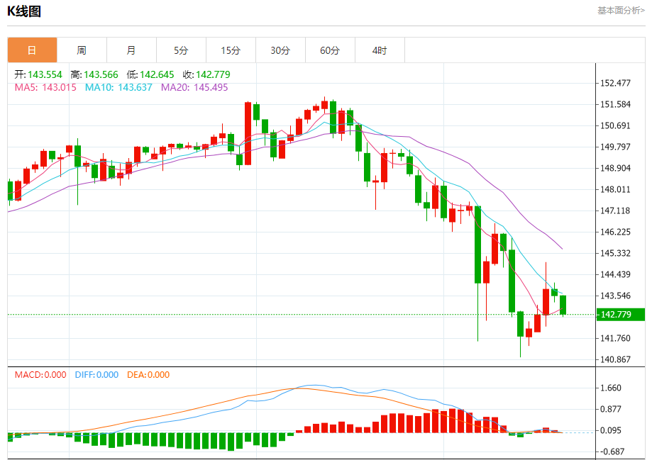 今日周四,截止目前美元兑日元报142.791,下跌0.54%。