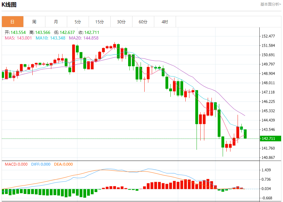 周四纽盘,美元兑日元交投于142.718,跌幅为0.59%。