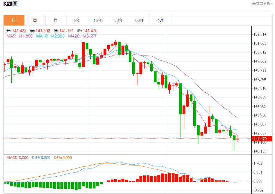 今日周五,截止目前美元兑日元报141.485,上涨0.07%。