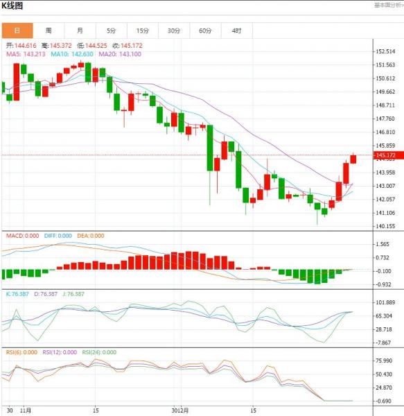 交易策略:可以在145.35---144.10的区间下限买入,有效破位40个点止损,目标在区间的上限。