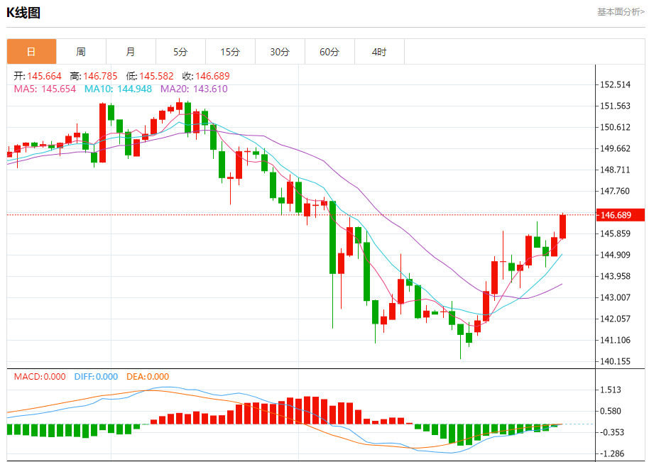 周二纽盘,美元兑日元交投于146.702,涨幅为0.69%。