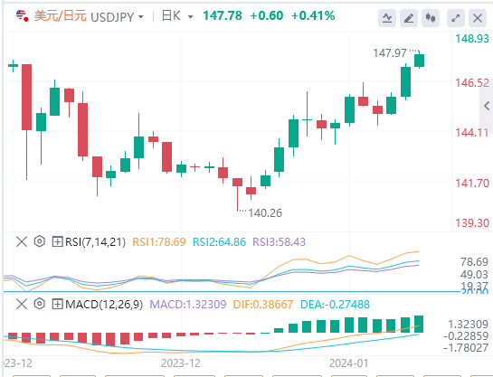 今天的预期交易区间在146.70支撑位和148.30阻力位之间。