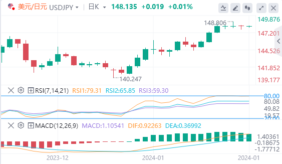 美元/日元周一下跌0.05%。美元兑日元扭转了上周五0.01%的涨幅,收于148.085。周一,美元/日元升至148.301的高点,随后跌至盘中低点147.613。