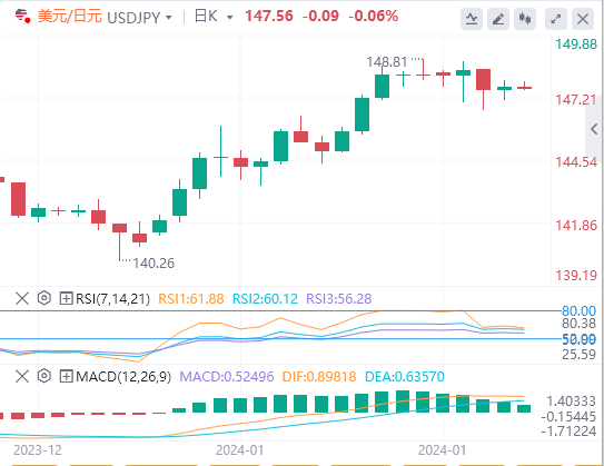 美元/日元周四上涨0.11%。美元/日元部分扭转了周三0.54%的跌幅,收于147.656。周四,美元/日元升至147.933的高点,随后跌至147.080的低点。