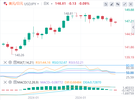 美元/日元周三下跌0.50%。美元/日元扭转了周二0.07%的涨幅,收于146.864。美元/日元升至盘中高点147.897,随后跌至周三低点146.005。