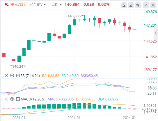 这美元/日元周四下跌0.31%。继周三下跌0.50%后,美元/日元收于146.413。美元/日元升至盘中高点147.112,随后跌至周四低点145.891。