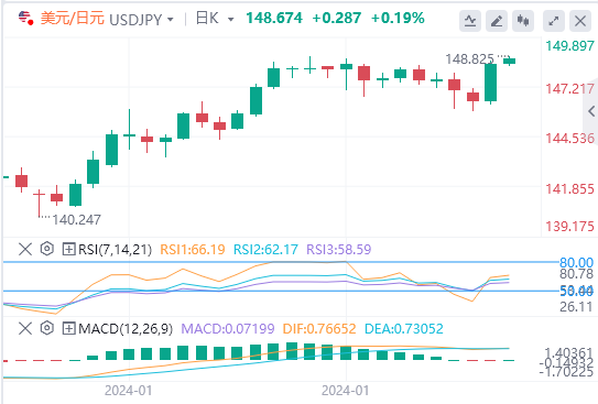 跌破148价位将使146.649支撑位和50日均线发挥作用。14日相对弱指标60.61表明美元/日元在进入超买区域之前回到149价位。