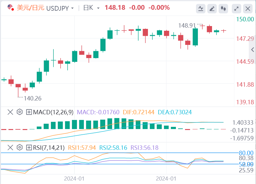 美元/日元周三上涨0.16%。美元/日元部分扭转了周二0.49%的跌幅,收于148.172。美元/日元升至高点148.256,然后跌至低点147.614。