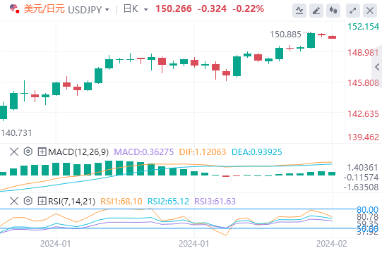 美元/日元周三下跌0.16%。美元/日元部分扭转了周二0.96%的涨势,收于150.523。美元/日元升至150.781的高点,然后跌至150.345的低点。
