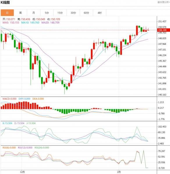 行情分析:汇价高见150.436,低见150.049。上一交易日,基本面上看:在当前宏观面有利于美元的情势下,日元走势偏软。技术面上看,此前连续七个交易日保持在被突破的149.17技术位上方,技术位149.17是(11-12月)151.92-140.27跌幅的76.4%回撤位,各项技术指标继续保持在正向区域,显示美元强势仍能维持着。若上方高点151突破,上方将会测试去年11月份高点151.92。下方若回落148之下,美元/日元才可能产生转向走势。
