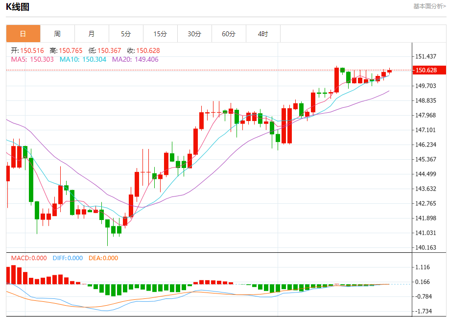 今日周五,截止目前美元兑日元报150.639,上涨0.07%。