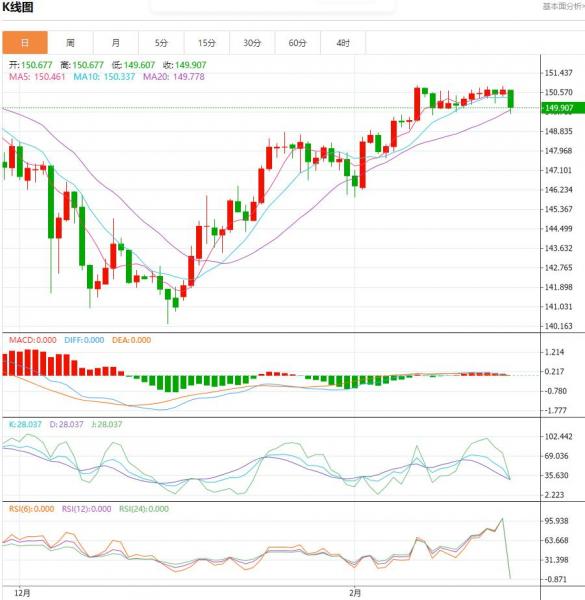 交易策略:可以在150.90---150.20的区间上限卖出,有效破位30个点止损,目标在区间的下限。