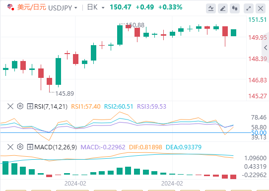 日线图上看,美元/日元保持在50日和200日均线上方,确认了看涨的价格信号。美元/日元突破150.201阻力位,将支持其向151.889阻力位移动。