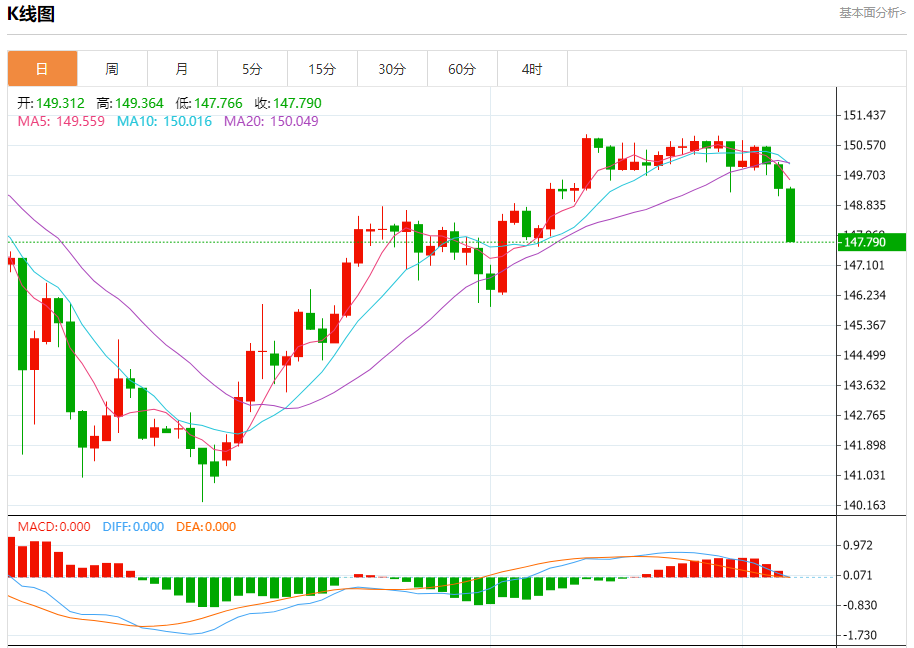 今日周四,截止目前美元兑日元报147.796,下跌1.03%。