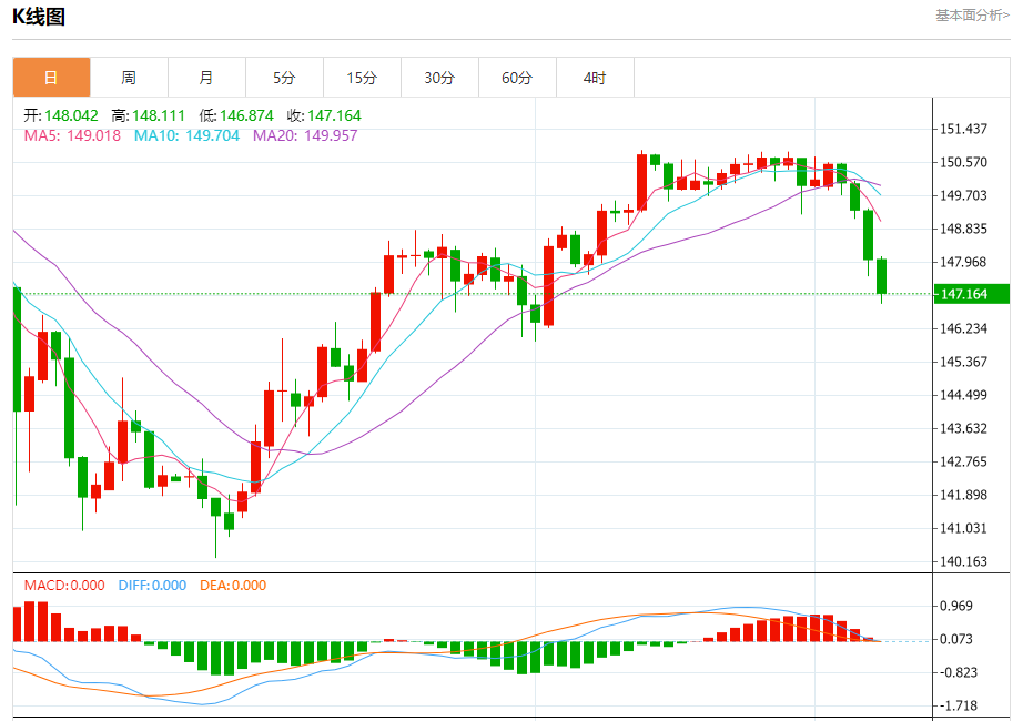 周五纽盘,美元兑日元交投于147.180,跌幅为0.59%。